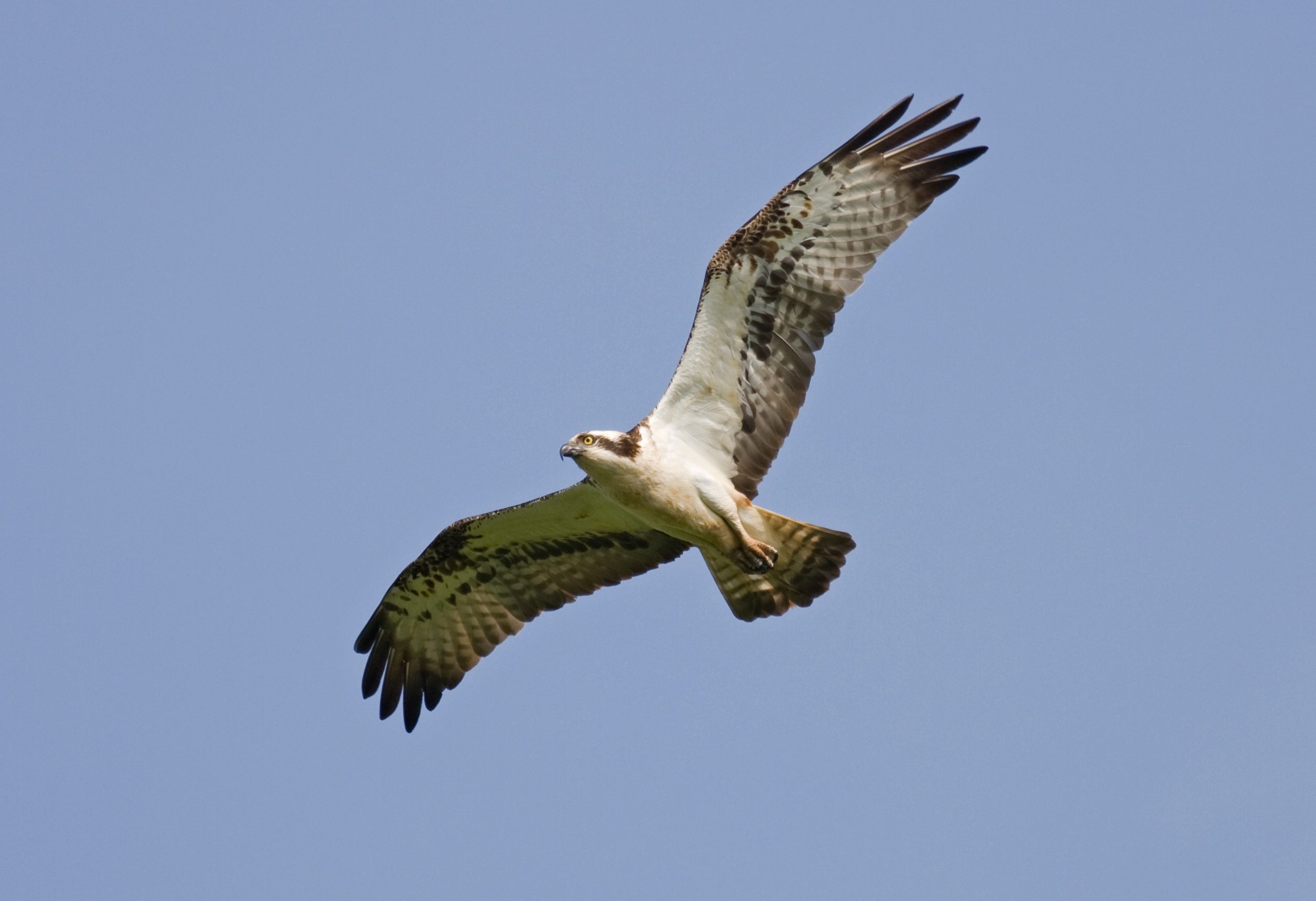 Ospreys are relatively large, growing to 55-62cm in length, with exceptionally long wings that extend to a span of 145-180cm. The wings are often held in a characteristic ‘W’ shape, making the bird unmistakeable in flight. When compared with other birds of prey in Britain, it appears larger than a buzzard but obviously smaller than a golden eagle. They are dark brown above and white below, and in Britain can sometimes be confused with some of our larger gulls. The breast has a variable brown band, more pronounced in females than males. The head is white with a dark brown band across the eyes. The eyes are yellow, although orange in young ospreys. They weigh 1.2-2kg and males are 5-10% smaller than females..
