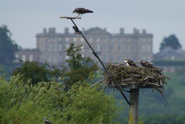 prominent trees, normally conifers, and as they tend to be added to every year, can become quite large. The female lays a clutch of 2-4 eggs, normally 3. Eggs are incubated for 35-37 days, predominantly by the female, with the male hunting for the both of them. Once the chicks hatch the female only leaves the nest for very short periods of time, and the male catches fish for the whole family. The chicks grow quickly and fledge after 51-56 days. About 3 weeks later the female departs for Africa and the male continues to feed the chicks for a further 1-2 weeks. The rest of the family then follow suit, all departing within a few days of each other. The adults return to their breeding quarters the following spring, but juveniles remain in Africa for a year and don’t return to the UK until