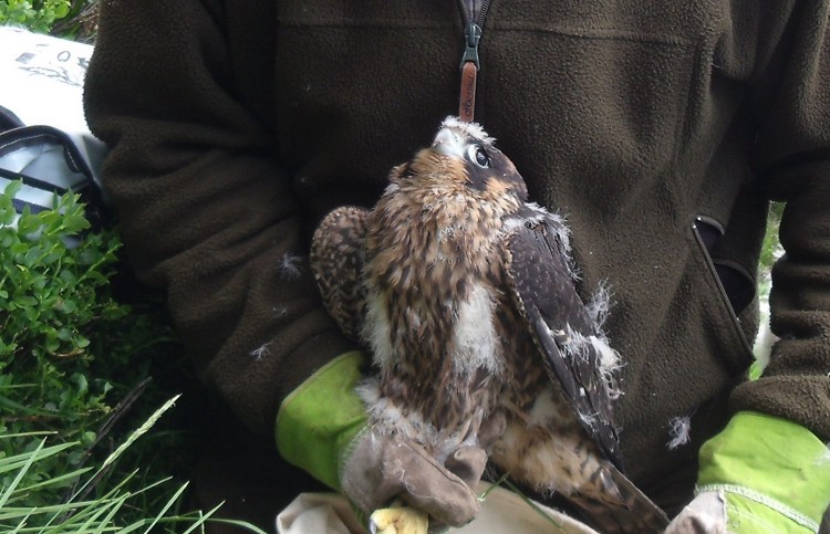 Vega was a female peregrine chick ringed on 28th June 2010 on the RSPB Abernethy Nature Reserve in Strathspey, Highland. She was one of a brood of four young – two males and two females. We went to the eyrie at 8.30am and I was accompanied by RSPB staff, Desmond Dugan, Bob Moncrieff and Gareth Marshall. Gareth climbed up to eyrie and lowered the young in a bag to the bottom of the cliff where we ringed her and fitted the satellite transmitter. She was the older female chick.