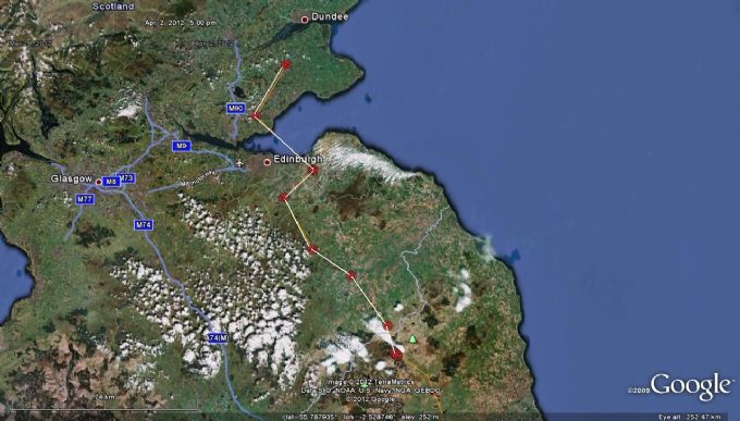 Beatrice roosted last night north side of Kielder Forest and crossed into Scotland just north of Catcleugh Reservoir about9.30am. Flew by St Boswells and Galashiels to Gorebridge by 1pm. From 2p to 4pm Sheltering in a wood SE of Tranent – probably due to NE winds and rain showers; then flew to Fife and at 6pm was SW of Cupar flying NNE at 54km/hr. The forecast tonight is for snow and strong north winds so she’ll have to work hard to get round the Grampians to Moray tomorrow.