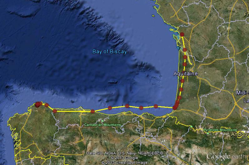 Rothgiemurchus ledt his haunts in Galicia just after 0800GMT on 2nd May and flew all the way along the north coast of Spain. What an extra cost in travelling because he make this big dogleg to Galicia instead of a direct migration through Spain – will he ever learn? He flew fast at 60kph and just after Gijon her headed out over the Bay of Biscay and tracked offshore, being some 20 km north of Santander at 1700hrs and an hour later he reached an overnight roost just SW ofLa Benne, north of Bayonne after a flight of 535 km. On 3rd he headed north through France, in from the coast, starting at 0500GMT and stopping to fish at Etang de Soustons arounf 0800hrs. He crossed the Giroinde estuary between 1400 and 1500 hrs and settled to roost at 1800GMT north of Rochefort. A day trip of 242 km.